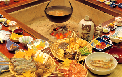 白山の恵みである素晴らしい自然な食材を炭火で焼きながらのアツアツを食して頂く。その昔、人々がしてたであろう食事のスタイルそのままの宴はまるで日本昔話にでも出てきそうな感じ。まるでタイムスリップしたような体験を楽しんで頂けることでしょう。