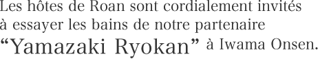 Roan vous propose ces deux types de bains privatifs reliés à la source. Ils seront à votre disposition exclusive. Vous pouvez très bien y adjoindre le plaisir d’un flacon de saké (okezake) et il est aussi possible d’effectuer une réservation pour la nuit.